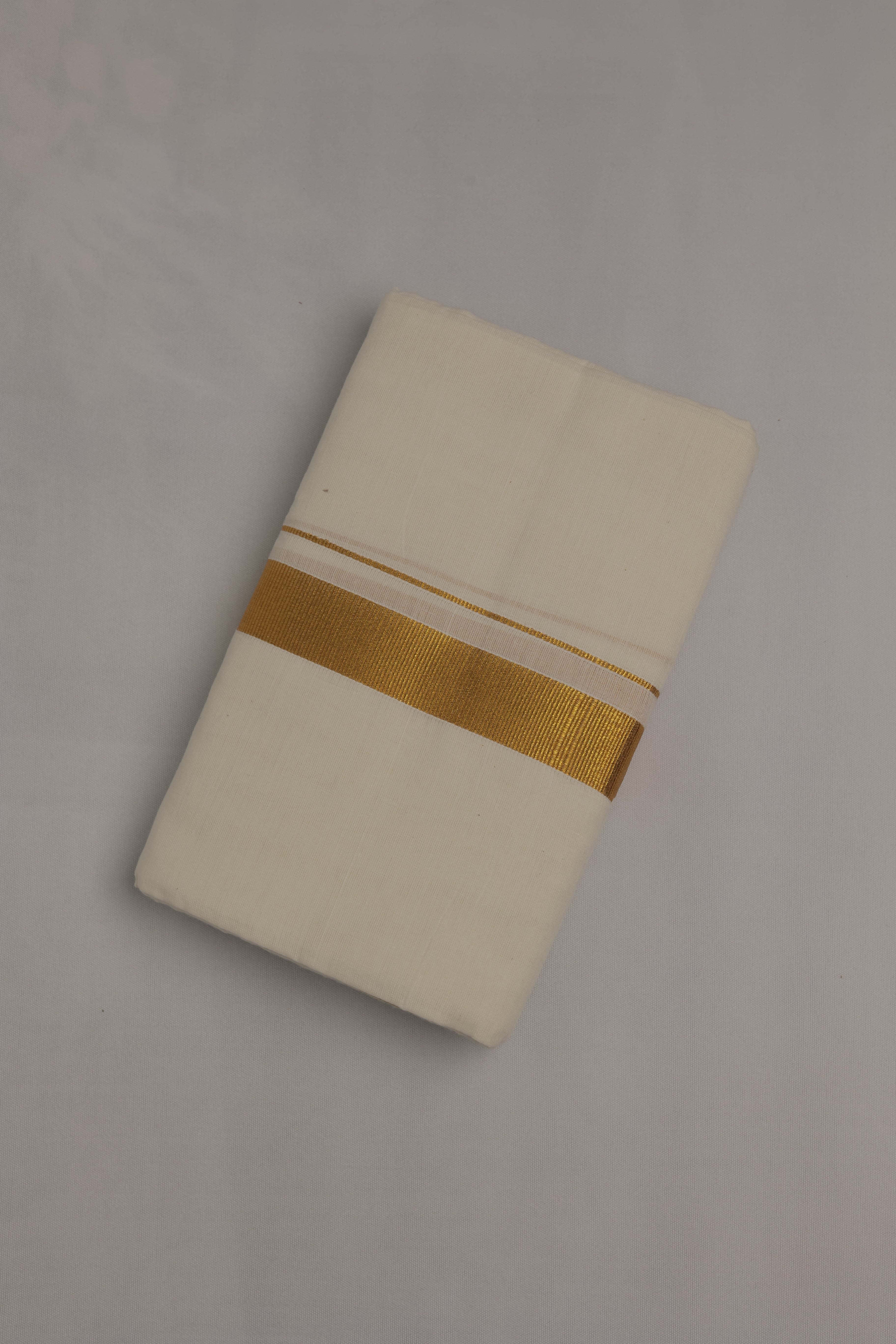 Crafted from quality cotton and woven on powerlooms, this economy dhoti offers both comfort and tradition. Featuring a subtle half white hue with an elegant 1-inch gold zari border (kara), it's ideal for daily wear, rituals, or traditional functions. Length: 3.65 to 3.85 meters.